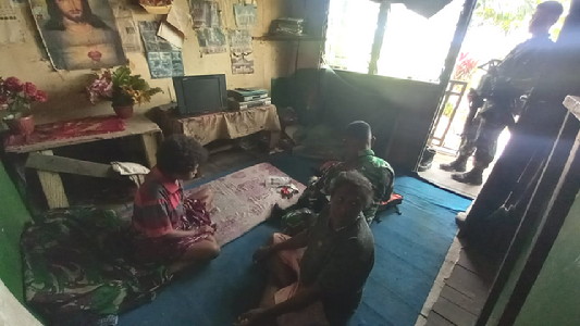 BNEWS - Personel Kesehatan TNI di Pos Batom Satgas Yonif 126/KC, mendatangi rumah salah satu warga Kampung Batom II, Distrik Batom, Kabupaten Keerom, yang terkena penyakit malaria, untuk memberikan perawatan.