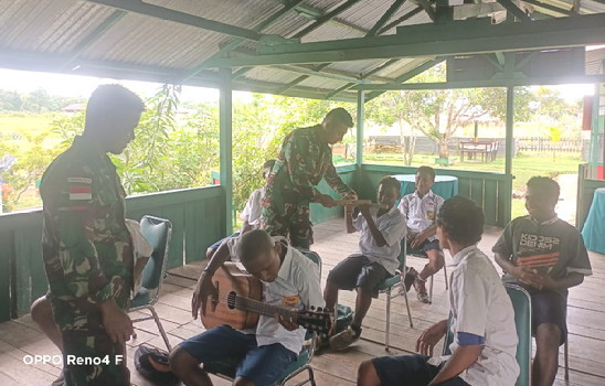 BNEWS - Prajurit TNI personel Pos Kotis Satgas Pamtas RI-PNG Yonif 126/KC, menberikan kursus kilat kepada siswa SMP Negeri 1 Senggi, tentang cara bermain gitar dan seruling sebagai sarana hiburan, bertempat di Pos Senggi Satgas Yonif 126/KC, Distrik Senggi, Kabupaten Keerom, Rabu (09/02/2022).