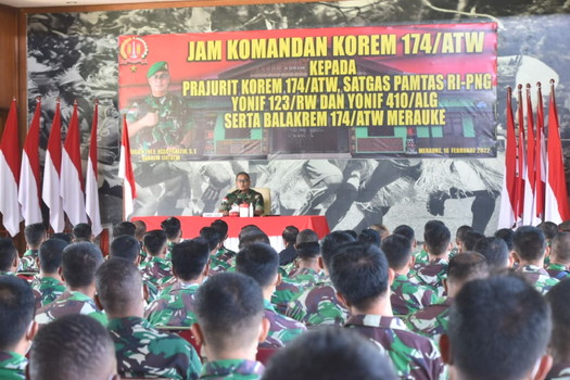 BNEWS - Danrem 174/ATW Merauke Brigjen TNI E. Reza Pahlevi memberikan pengarahan kepada Prajurit dan PNS Korem 174/ATW beserta Balakrem, perwakilan Satgas Pamtas RI-PNG Yonif 123/RW, Yonif 410/ALG dan Satgas Pamrahwan Yonif 315/Garuda, di Aula L.B Moerdani Makorem, Rabu (16/2/2022).