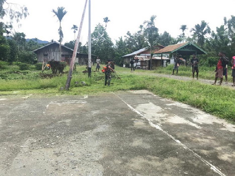 BNEWS - Sebagai wujud kepedulian terhadap keindahan dan kebersihan kampung, personel Satgas Yonif 126/KC Pos Waris bersama warga Kampung Banda, Distrik Waris, Kabupaten Keerom, Papua, menggelar kegiatan karya bakti.