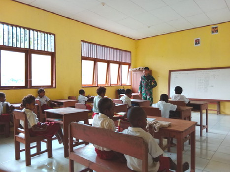 BNEWS - Prajurit TNI Satgas Pamtas RI-PNG Yonif 126/KC, menjadi tenaga pendidik atau guru di SDN Bompai Distrik Waris, Kabupaten Keerom, perbatasan Papua-PNG.
