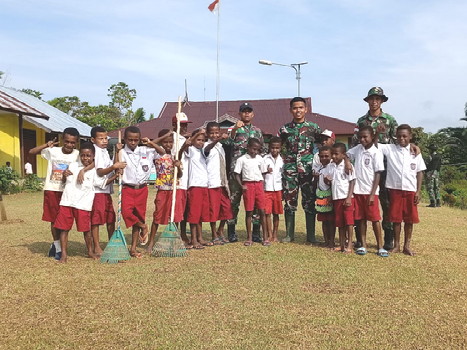 BNEWS - Mengajarkan kepedulian terhadap kebersihan lingkungan sejak usia dini, prajurit Satgas Pamtas Yonif 126/KC Pos Yuruf, mengajak para murid membersihkan SD YPPK Yuruf-Amgroto, Distrik Yaffi, Kabupaten Keerom.