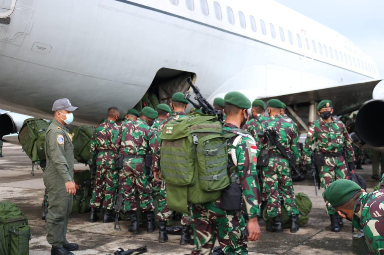MAGETAN - Empat pesawat TNI Angkatan Udara (AU) diberangkatkan membawa pasukan Batalyon Infanteri (Yonif) Para Raider 501 Kostrad, yang akan melaksanakan tugas pengamanan di perbatasan Republik Indonesia - Papua Nugini (RI-PNG) sebagai satuan tugas penyangga (Mobile).