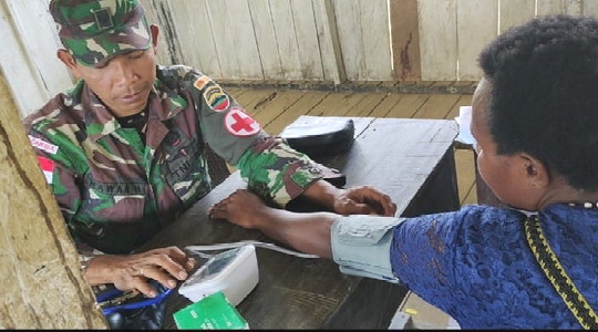 BNEWS - Agar kesehatan masyarakat di wilayah perbatasan tetap terjaga, TNI anggota Satgas Yonif 126/KC Pos Somografi bersama Dinas Kesehatan Kabupaten Keerom, menggelar pengobatan massal di Kampung Somografi, Distrik Web, Kabupaten Keerom, Papua.