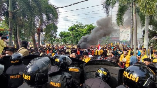 BNEWS - Aksi demo ribuan mahasiswa di depan Gedung DPRD Sumatera Barat (Sumbar) di Jalan Khatib Sulaiman Padang, berakhir ricuh. Berawal dari aksi dorong.