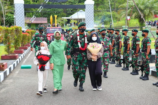 BNEWS - Komandan Brigade Infanteri (Danbrigif) 24/Bulungan Cakti, Letkol Inf Teguh Wiratama, memimpin upacara penyambutan 450 prajurit Satgas Yonif Raider 613/Raja Alam, usai melaksanakan tugas selama satu tahun di wilayah Puncak Jaya, Papua, Rabu (13/04/2022).