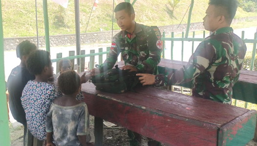 BNEWS - Personel TNI Satgas Pamtas RI-PNG Yonif 126/KC Pos Kalimao, melayani pengobatan gratis di Kampung Kalimao, Distrik Yaffi, Kabupaten Keerom, Papua.