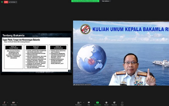 BNEWS - Kepala Bakamla RI Laksdya TNI Dr. Aan Kurnia, memberikan kuliah umum kepada puluhan mahasiswa Universitas Padjadjaran (UNPAD) secara daring dari Mabes Bakamla RI, Jl. Proklamasi No. 56, Menteng, Jakarta Pusat.