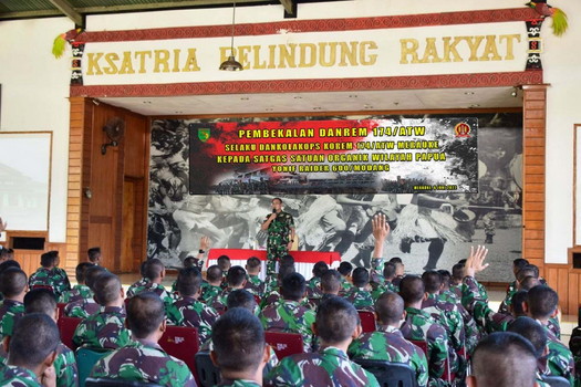 BNEWS - Sebelum melaksanakan tugas operasi di wilayah Komando Pelaksana Operasi (Kolakops) Korem 174/ATW Merauke, prajurit TNI Satgas satuan organik wilayah Papua Yonif Raider 600/Modang, menerima pembekalan dari Danrem Brigjen TNI E. Reza Pahlevi, selaku Komandan Komando Pelaksana Operasi (Dankolakops) Korem, di Aula L.B. Moerdani Makorem Merauke, Senin (6/6/2022).