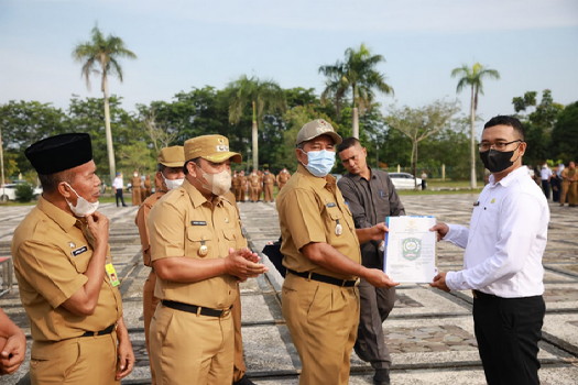 BNEWS - Bupati Siak Alfedri menyerahkan Surat Keputusan (SK) pengangkatan kepada 73 CPNS, PPPK dan non guru yang lulus seleksi pada tahun 2021 lalu, di halaman kantor Bupati Siak, Senin (6/6/2022).