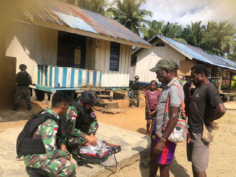 BNEWS - Tim Kesehatan Satgas Pamtas Yonif 126/KC Pos Yabanda, memberikan pelayanan kesehatan berupa pengobatan gratis keliling kampung binaan Yabanda Distrik Waris, Kabupaten Pegunungan Keerom, di perbatasan Papua.