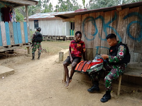 BNEWS - Prajurit Satgas Yonif 126/KC Pos Unggalom melaksanakan pemeriksaan kesehatan secara door to door ke rumah warga Kampung Umuaf, Kabupaten Keerom, Papua.