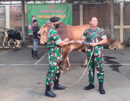 BNEWS - Memperingati Hari Raya Idul Adha 1443 H / 2022 M, Komando Garnisun Tetap I Jakarta (Kogartap I/Jakarta) melaksanakan pemotongan hewan kurban di Makogartap Gambir, Jakarta Pusat, Senin (11/7/2022).