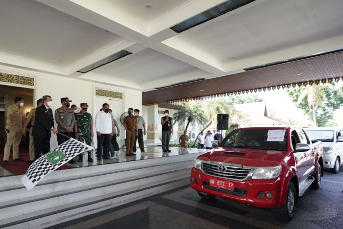 BNEWS - Gubernur Riau (Gubri) Syamsuar melepas mobil siaga penanganan wabah Penyakit Mulut dan Kuku (PMK), untuk mendistribusikan vaksin sekaligus obat-obatan bagi hewan seperti sapi, kerbau dan kambing, yang terdampak wabah PMK.