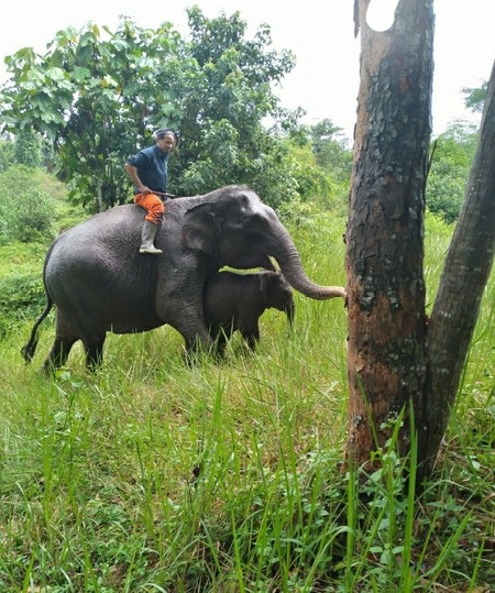 Petugas usai memandikan seekor gajah dan anaknya di Teso Nilo
