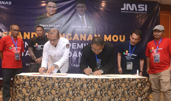 Penanda tanganan ini dilakukan Ketua JMSI Pusat Teguh Santoso dengan Ketua KPU Riau Hasyim Asy'ari disaksikan Wakil Ketua Dewan Pers Agung Darmajaya, Wakil Ketua Umum JMSI Rahiman Dani, Sekretaris Jenderal JMSI Eko Pamuji, dan Sekretaris Pokja Kepemiluan JMSI Faisal Mahrawa.