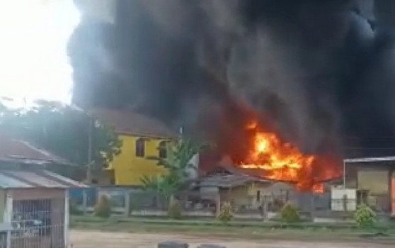 BNEWS - Api membakar gudang yang diduga sebagai penampungan bahan bakar minyak (BBM) ilegal, di Kelurahan Kenali Besar, Kecamatan Alam Barajo, Kota Jambi, Senin (15/8/2022).