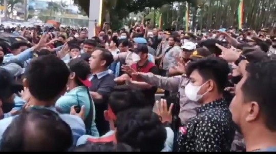 Karena tak kunjung ada anggota DPRD yang menjumpai mereka, mahasiswa mencoba masuk secara paksa dengan mendorong pintu pagar gedung DPRD yang dijaga ketat oleh kepolisian.