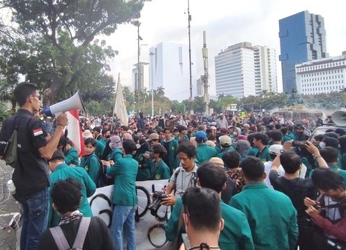 Terlihat mahasiswa mulai tiba sekitar pukul 15.50 WIB di Patung Kuda, setelah mereka berjalan kaki dari arah Jalan Medan Merdeka Selatan, Gambir, Jakarta Pusat.
