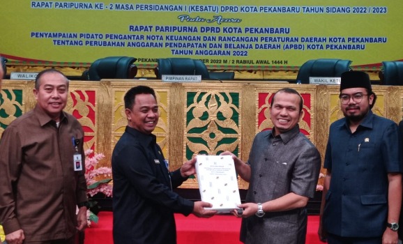 Setelah dibacakan, Sekda Kota Pekanbaru Muhammad Jamil beserta Asisten I Setdako Syoffaizal dan Kepala Badan Pengelola Keuangan dan Aset Daerah (BPKAD) Kota Pekanbaru Yulianis, menyerahkan nota keuangan dan ranperda tentang Perubahan APBD Kota Pekanbaru tahun 2022 kepada Ketua DPRD Pekanbaru Muhammad Sabarudi ST didampingi Wakil Ketua Ginda Burnama ST dan Ir Nofrizal MM.