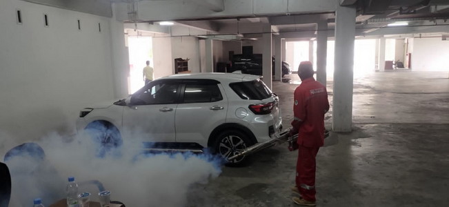 Fogging ini dilakukan mulai dari menyemprot parit-parit depan gedung, basement, lobi, halaman, mushola, ruang tunggu, hingga berlanjut ke ruang-ruang kerja di Sekretariat DPRD Pekanbaru.