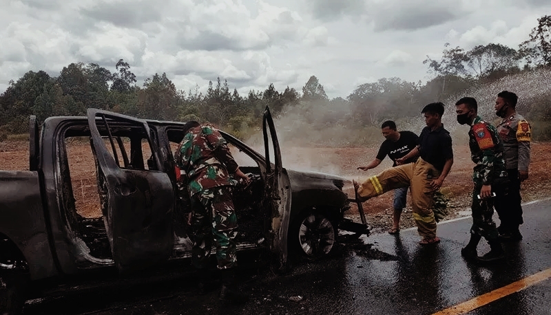 Setelah oknum aparat inisial D itu kembali, petugas kehutanan masuk ke lokasi dan saat di dalam lokasi, ada informasi bahwa mobil dinas yang mereka gunakan terbakar.
