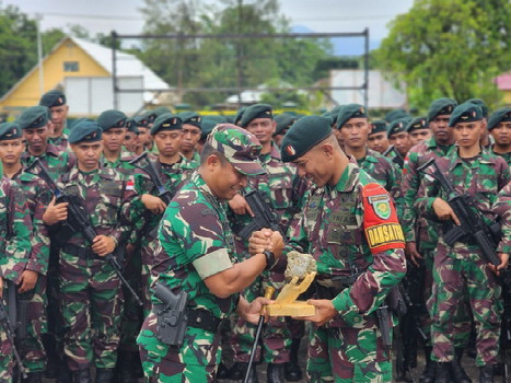 BNEWS - Dandim Mimika memimpin upacara pelepasan Satgas Satuan Organik Yonif R 301/Prabu Kian Santang (PKS) Kolakops Korem 173/PVB, Sabtu (24/12/2022) di Lapangan Upacara Kodim 1710/Mimika.