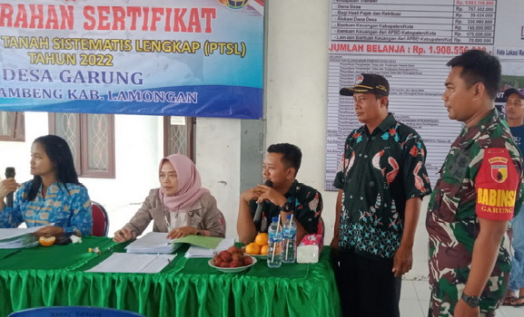 BNEWS - Sebanyak 500 Kepala Keluarga (KK) di Desa Garung, Kecamatan Sambeng, Kabupaten Lamongan, Jawa Timur, menerima sertifiktat tanah yang dibagikan oleh tim Kantor Pertanahan Lamongan melalui program Pendaftaran Tanah Sistematis Lengkap atau PTSL.