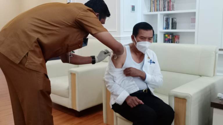 PEKANBARU - Walikota Pekanbaru Dr. H. Firdaus, S.T, M.T menerima vaksin Covid-19 untuk kelompok usia lanjut atau di atas 59 tahun, di Ruang Kerjanya, Lantai V Gedung Utama Komplek Perkantoran Tenayan Raya, Selasa (16/2/2021).