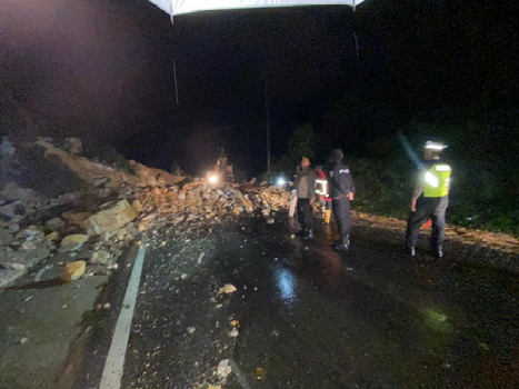 BNEWS - Selasa pagi (21/03/2023) tadi telah terjadi longsor di lereng perbukitan di sisi Jalan Lintas Riau - Sumbar KM 81, Desa Merangin Kecamatan Kuok Kabupaten Kampar. Akibat longsor ini badan jalan tertutup material berupa tanah, bebatuan dan memutus arus lalulintas dari kedua arah putus total.