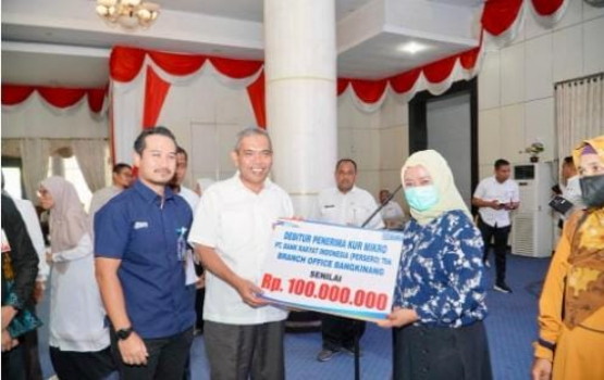 Dalam kesempatan ini Pj. Bupati Kampar berkenan menyerahkan secara simbolis plakat KUR kepada pelaku UMKM Kabupaten Kampar yang menerima kucuran dana KUR.**/ald