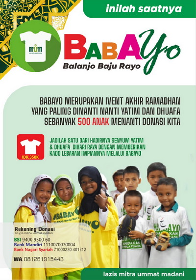 Karena itu Lazis Mitra Ummat Madani Padang, Sumatera Barat, mengajak semua pihak yang peduli untuk ikut menjadi saksi hadirnya satu senyum dari mereka dengan menyisihkan rezeki terbaiknya. Sehingga hari raya ini menjadi milik kita semua.