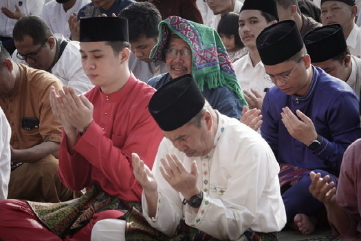 BNEWS - Gubernur Riau (Gubri) Syamsuar bersama Wakil Gubernur Riau (Wagubri), Brigjen TNI (purn) Edy Natar Nasution, melaksanakan salat Idul Fitri 1444 Hijriah bersama warga Kota Pekanbaru di halaman kantor Gubernur Riau, Sabtu (22/04/2023).