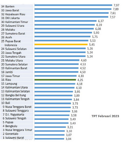 Urutan 16 tersebut relatif rendah bila dibandingkan dengan TPT nasional sebesar 5,45 dan jika dibandingkan TPT Provinsi di Sumatra, Riau ada diurut 7 dari 10 provinsi.