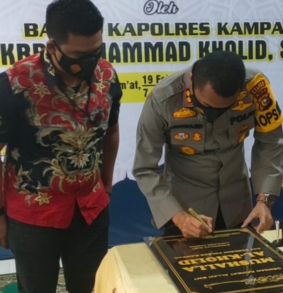 Peresmian ditandai dengan penandatangan Prasasti Peresmian Mushalla Al-Kholid oleh Kapolres Kampar AKBP Mohammad Kholid SIK.
