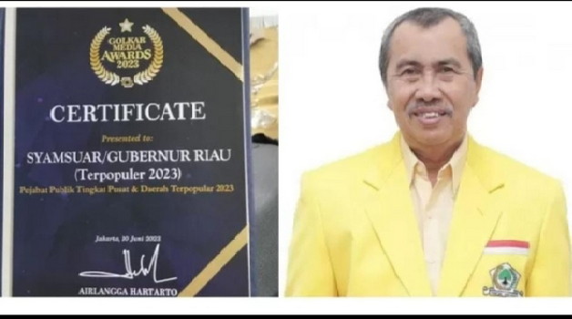 BNEWS - Dewan Pimpinan Pusat (DPP) Partai Golkar memberikan apresiasi kepada Gubernur Riau, Syamsuar, sebagai Pejabat Publik Terpopuler Tahun 2023, pada acara Golkar Media Award yang ditaja portal berita www.kabargolkar.com.