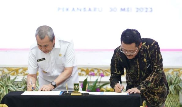 BNEWS - Gubernur Riau (Gubri) Syamsuar menandatangani nota kesepakatan (MoU) dan rencana kerja dengan Komisi Pengawas Persaingan Usaha (KPPU), tentang sinergi dalam pengawasan persaingan usaha dan pengawasan kemitraan, di Gedung Daerah Balai Serindit, Selasa (30/5/2023).