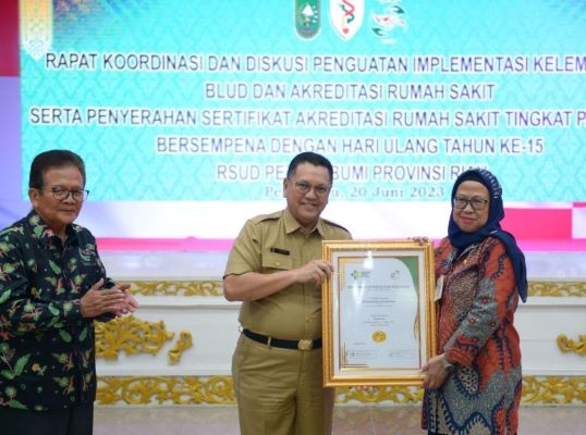BNEWS - Rumah Sakit Umum Daerah (RSUD) Petala Bumi Provinsi Riau meraih Akreditasi Tingkat Paripurna. Penyerahan Sertifikat Akreditasi dilakukan oleh Asisten III Sekretariat Daerah Provinsi (Setdaprov) Riau, Joni Irwan, di Gedung Daerah Balai Serindit, Selasa (20/6/2023).