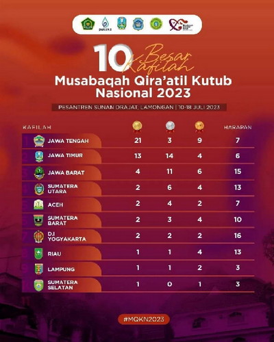 Seperti diketahui, dalam ajang MQKN tahun 2023 ini, provinsi yang berhasil meraih peringkat pertama adalah Provinsi Jawa Tangah, peringkat dua Jawa Timur, peringkat ketiga Jawa Barat.