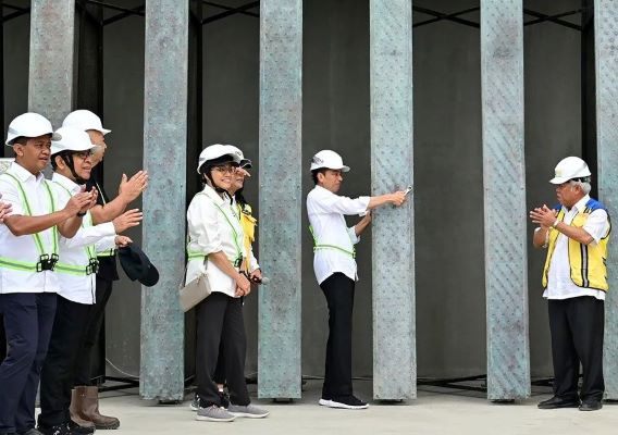 BNEWS - Presiden Jokowi meninjau perkembangan pembangunan Ibu Kota Nusantara (IKN) di Penajam Paser Utara, Kalimantan Timur, Jumat (22/9/2023). Dalam kesempatan ini Jokowi juga memasang bilah pertama Garuda di Kantor Presiden di IKN.