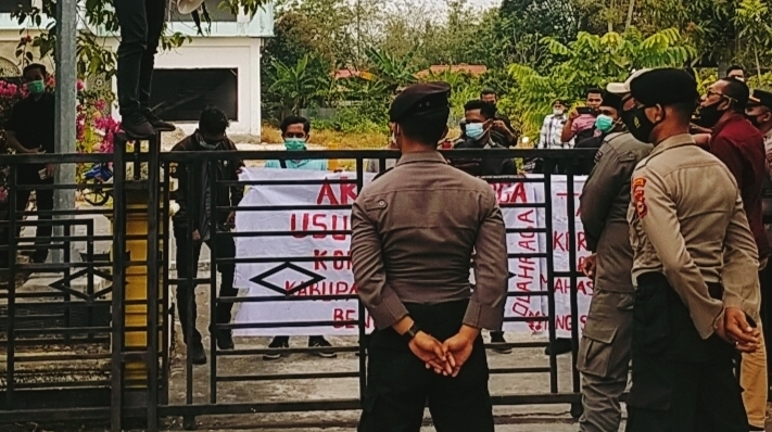BENGKALIS - Aliansi Mahasiswa Pelajar Peduli Olahraga (Amperga) Kabupaten Bengkalis berunjuk rasa di Kejaksaan Negeri Bengkalis, Rabu (24/2/2021) pagi, mendesak Kajari agar mengusut sampai ke akar-akarnya kasus dugaan korupsi dana hibah KONI Bengkalis Rp 12 miliar tahun 2019.