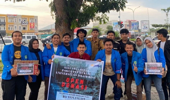 BNEWS - Peduli Palestina, puluhan mahasiswa fakultas Hukum Universitas Islam Riau (UIR), menggelar aksi galang dana di jalan Bandara Sultan Syarif Kasim II, Tabek Gadang dan Simpang Arifin Ahmad, Sabtu (21/10/2023).