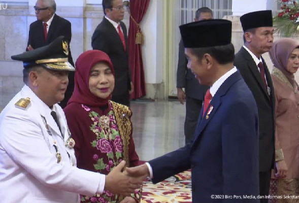 BNEWS - Presiden Jokowi resmi melantik Brigjen TNI (Purn) Edy Natar Nasution sebagai Gubernur Riau (Gubri) definitif, sisa masa jabatan 2019-2024, berlangsung di Istana Negara, Senin, (27/11/2023).
