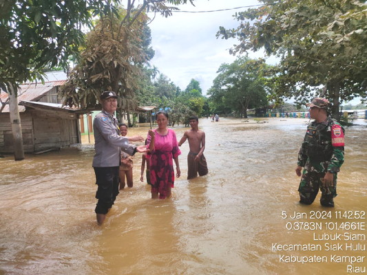 Kedua personel ini bersinergi membantu warga yang terdampak banjir di Dusun-I, II, III dan Dusun IV Desa Tanjung Balam kecamatan Siak Hulu kabupaten Kampar, Jum'at (5/1/2024). Sebanyak 192 Kepala Keluarga (KK) yang terdampak banjir dibantu.
