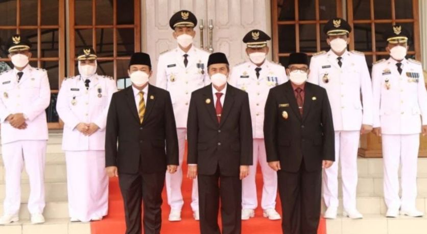 PEKANBARU - Tiga kepala daerah di Propinsi Riau pemenang Pilkada 9 Desember 2020 dilantik secara resmi oleh gubernur Riau (Gubri) Syamsuar di Gedung Daerah, Jumat (26/2/2021).