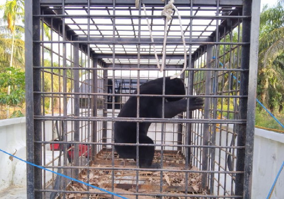 BNEWS - Tim Polhut, Dokter Hewan dan Petugas Teknis Balai Besar KSDA Riau mengevakuasi Beruang Madu (Helarctos malayanus) dari kebun sawit warga, usai memangsa ternak ayam di Dusun 2 Mekar Indah, Kampung Sungai Tengah, Kecamatan Sabak Auh, Kabupaten Siak, Rabu (27/3/2024).
