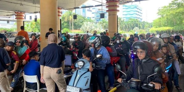 BNEWS - Hari ke 3 libur lebaran, Taman Impian Jaya Ancol di Jakarta Utara terus didatangi pengunjung. Terlihat antrean pengunjung terjadi di pintu masuk Ancol pada Jumat (12/4/2024), pukul 11.40 WIB. Petugas sampai membuka 4 loket masuk bagi pemotor.
