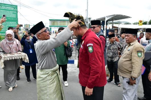 Walikota Dumai diwakili Staf Ahli Bidang Pembangunan, Informasi, Teknologi, Ekonomi dan Keuangan, Syawir Kasim didampingi sejumlah pihak yang terlibat menyambut kedatangan kafilah dan memasangkan tanjak penghormatan kepada pimpinan rombongan.