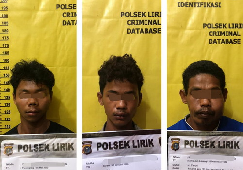 Ketiga tersangka adalah, RH (18) warga salah satu komplek perumahan perkebunan kelapa sawit di Kecamatan Lirik, ST (42) dan SM (22) yang juqa tinggal satu komplek, diringkus unit Reskrim Polsek Lirik, Minggu 5 Mei 2024, pukul 00.30 WIB.