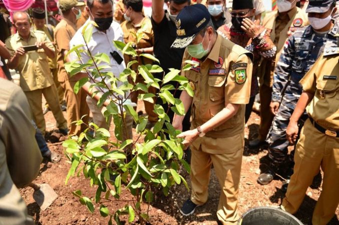BENGKALIS - Gubernur Riau (Gubri) Syamsuar menanam pohon geronggang di Pantai Wisata Raja Kecik, Desa Muntai Barat, Kecamatan Bantan, Kabupaten Bengkalis, sebagai upaya mengatasi abrasi dan karhutla di lahan gambut.